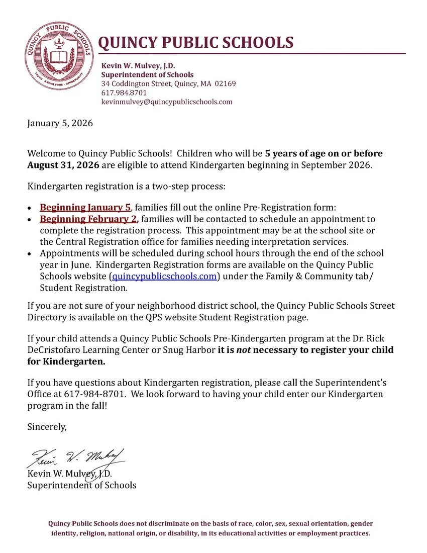 Online registration for the 2026-27 School Year opened a few days ago on January 5th. Families with children who will be 5 years of age on or before August 31, 2026, are eligible to attend Kindergarten beginning in September 2026. Please use the form here to register online and see the correspondence from QPS attached below for more details.