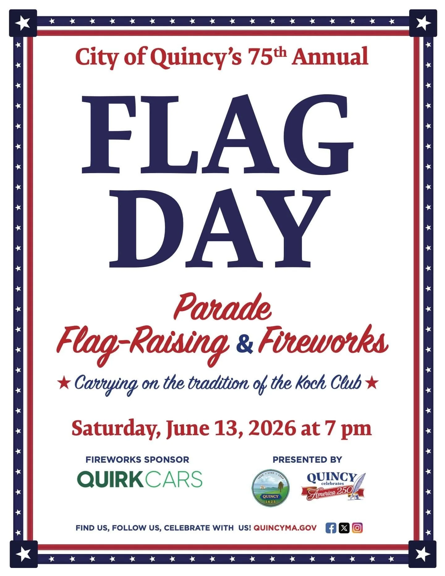 On Saturday, June 13th, 2026, at 7 PM, the City of Quincy will host its 75th Annual Flag Day Parade. An amazing tradition that the entire family will enjoy. See you there!
